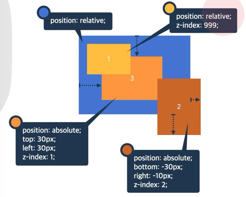 | z-index | 요소의 쌓임 정도를 지정 | auto : 부모 요소와 동일한 쌓임 정도 숫자값 : 숫자가 높을 수록 위에 쌓임 |